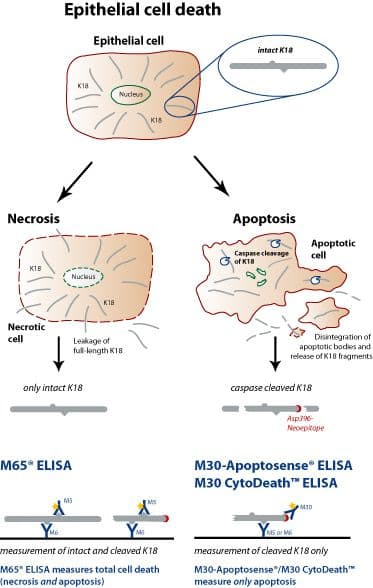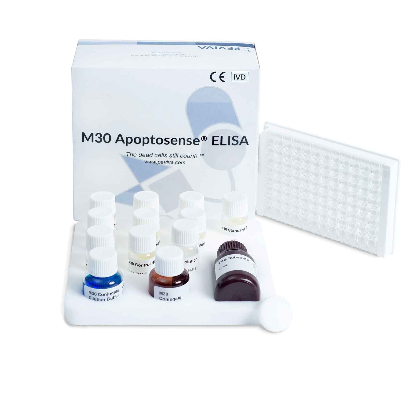 M30 Apoptosense® ELISA (ccK18, K18F, K18Asp396NE-M30) M30 Apoptosense® is an enzyme-linked immunosorbent assay (ELISA) for the quantitative detection of caspase-cleaved Keratin-18 (ccK18, K18F, K18Asp396-NE: M30 neo-epitope) levels in cytosolic cell extracts, cell culture supernatants, human serum or plasma or other body fluids.